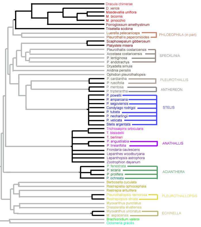 Pridgeon et al. analyzed three different large segments of DNA for 54 species of Pleurothallids. Two segments were of conservatively evolving plastid DNA, and one was of more rapidly evolving nuclear DNA. Each of these three independent segments produced a "family tree" (cladogram). The three trees differ in many details, but agree on some basic patterns. The connections and branches that I have drawn in black on the left side of the figure below are the ones that are exactly the same in all three independent trees. This "consensus tree" carries a lot of weight. The groupings that appear in black in this tree are almost certainly real, since all three independent DNA analyses, of very different kinds of DNA, agree on them. In the case of the "Stelis" group, more sampling is needed to resolve the branching patterns within the group, but the existence of the group as a whole is not in doubt, since it is confirmed by all three analyses. The gray lines connecting the branches at the far left are not agreed upon by all the analyses, but are the result of analyzing the combined results to try to extract more information. These could change with additional sampling. On the right side of the figure are some of the proposed genera of Pridgeon et al. I have included only those genera that are based on the studies of all three DNA segments. This means I leave out Diodonopsis and the expanded concept of Andinia, which are each based on the study of only one DNA segment. I don't mean to imply that we have to accept the proposed genera on the right side of the figure, only the branching patterns in black on the left. For example, we could sink Anthereon into Pleurothallis without contradicting anything in this tree. L. Jost