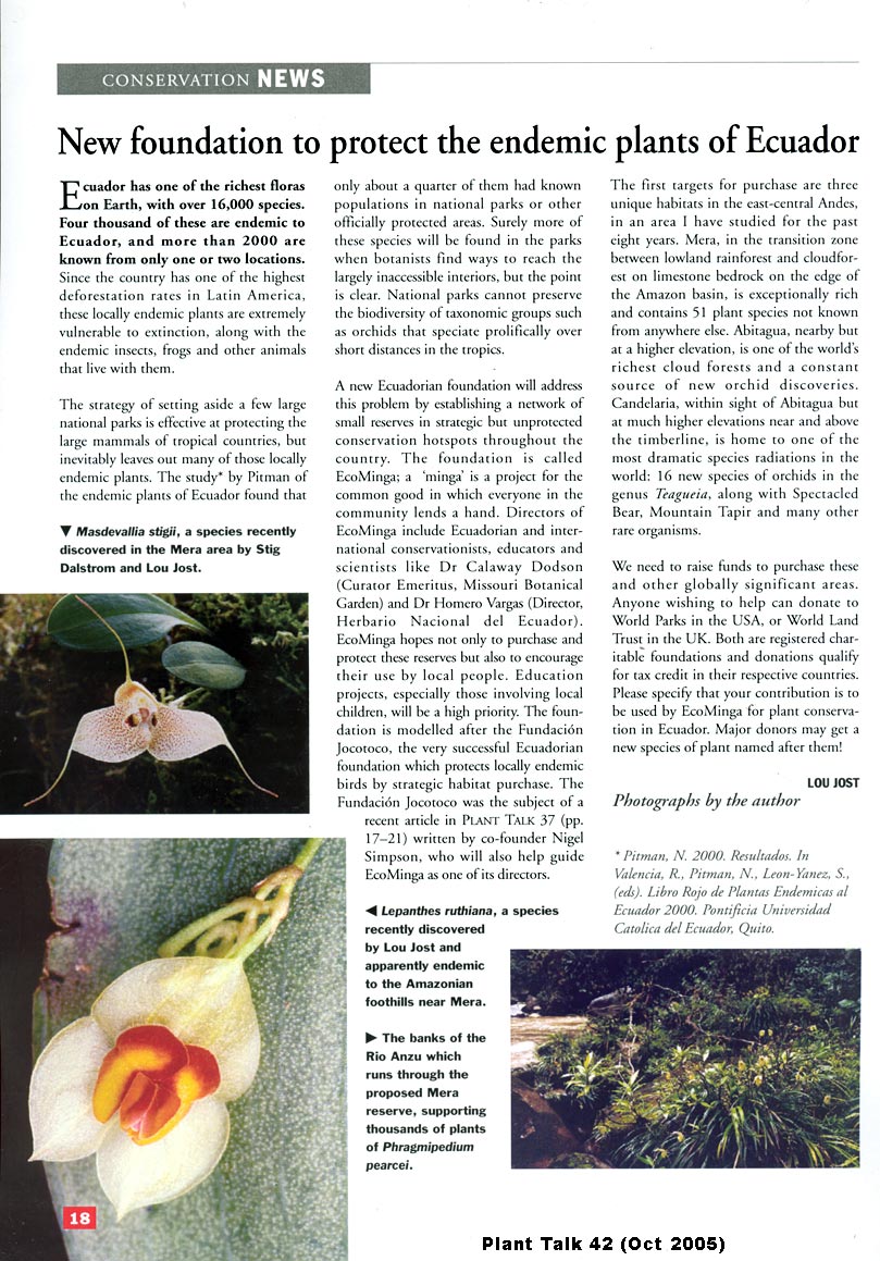 Please see the EcoMinga website for more information and for our US and UK partner foundations who can accept tax-deductible donations for us. Also see the article about us in Plant Talk magazine.